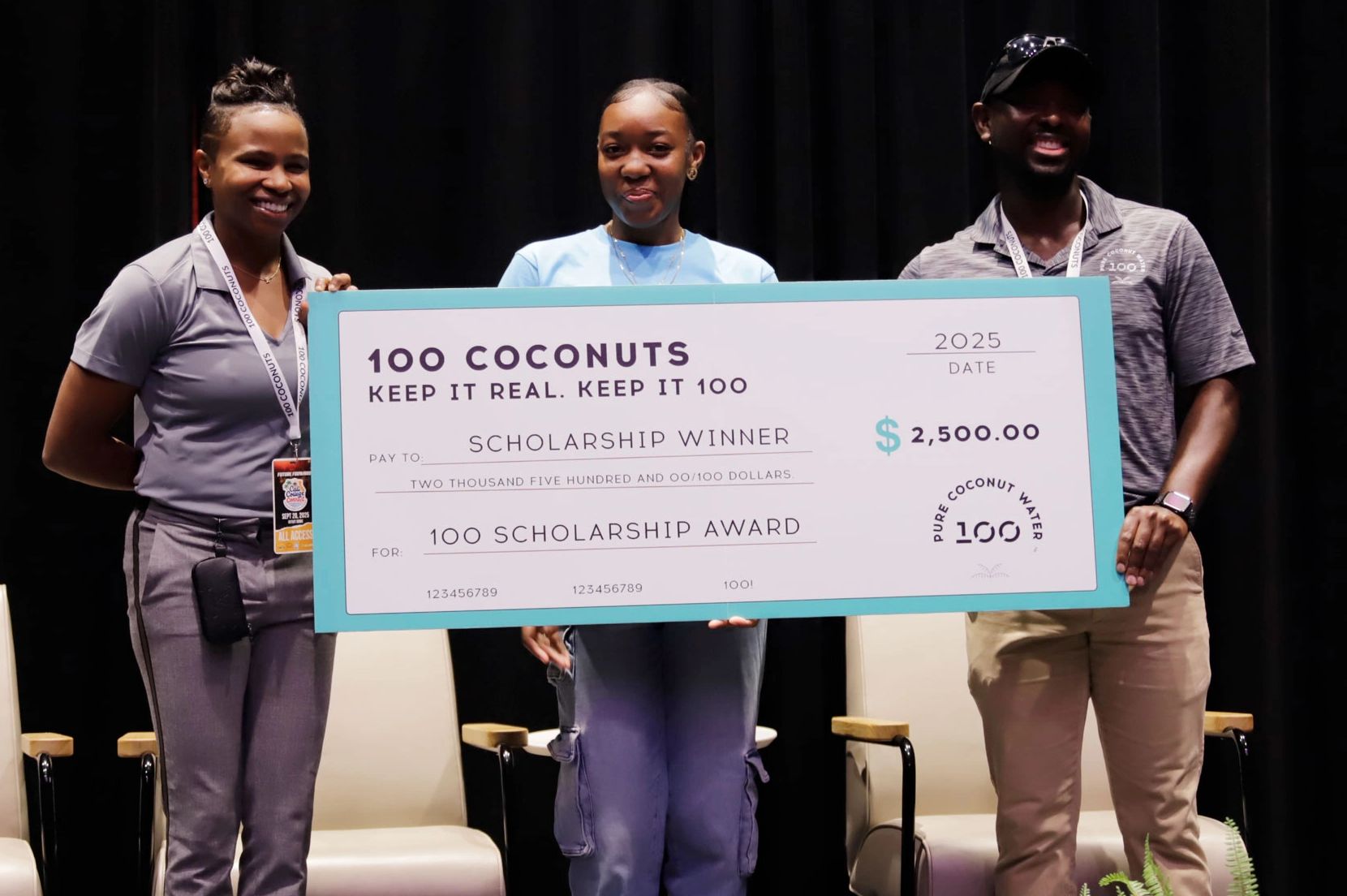 Congratulations to our scholarship winner, Aisha Stephens! She received the $2,500 scholarship sponsored by 100 Coconuts, presented by Paige Lowe and Sterling McRae. Her heartfelt and authentic submission kept it real and kept it 100—we are so proud of our Cali College Connect student!